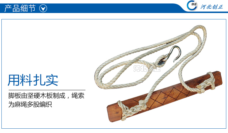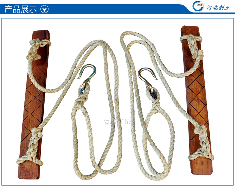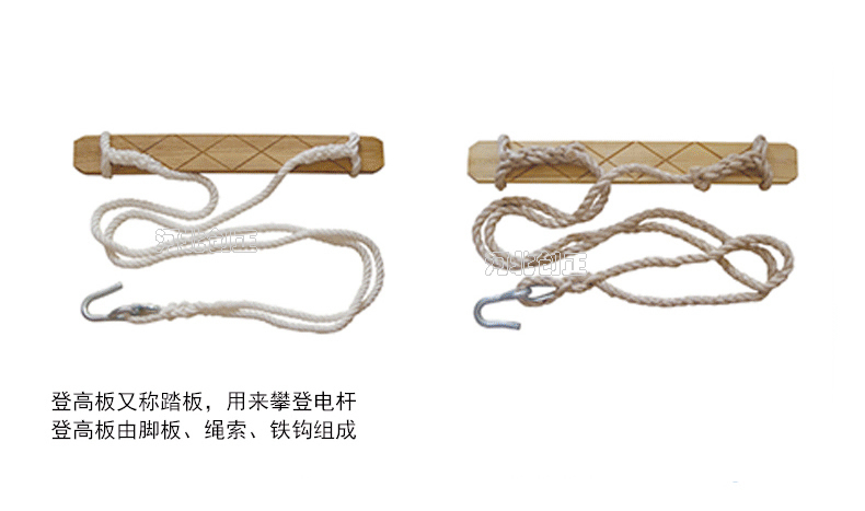 登高板又稱踏板,升降板。用來攀登電桿。登高板由踩板、繩索、鐵鉤組成。踩板用堅(jiān)硬的木材制成,繩索為16mm多股白棕繩或尼龍繩,繩兩端系結(jié)在踏板兩頭的扎結(jié)槽內(nèi),繩頂部系結(jié)鐵掛鉤,繩的長度應(yīng)與使用者的身材相適應(yīng)。