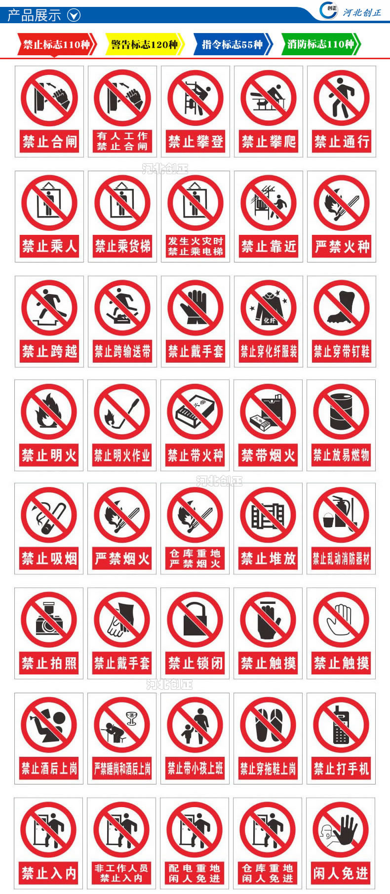 2、產(chǎn)品內(nèi)容:禁止、指令、提示、線路相位、消防、通信、交通等。