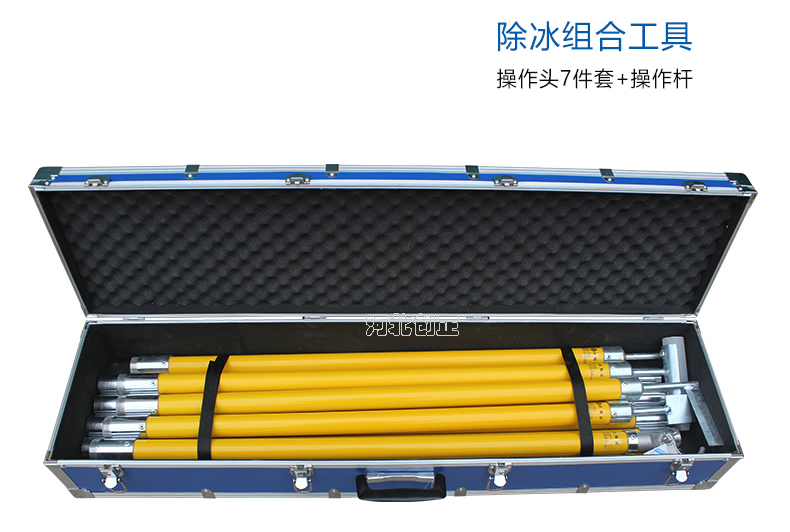 除冰組合工具由絕緣桿和不同的操作頭組成,通過敲、鏟、鉤等方式除去瓷瓶、支架、導(dǎo)線及桿塔上的積雪及覆冰。除冰作業(yè)時,選取操作頭,安裝到絕緣桿的一端并擰緊后使用。絕緣桿分為長、短規(guī)格,根據(jù)現(xiàn)場實際情況進(jìn)行組合。